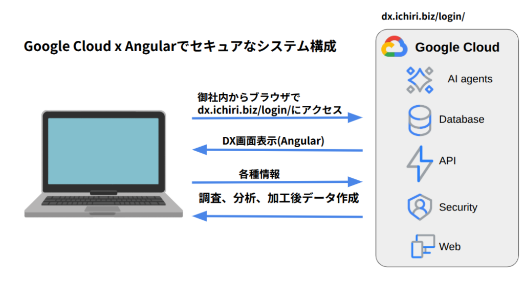 また通常のWeb画面はページ全体をやり直さなければならないといけないため、改修が大掛かりになり、時間・費用・品質ばらつきによるトラブルが発生します。 その上、Angularは画面を文字だけ変更など画面の部分部分だけ変更するので、圧倒的に速い操作となり皆様の業務を効率的に行えます。 いちりDX開発では、企業様の継続事業拡大のお役に立てるよう、最高のセキュリティで高速な環境と最新技術をGoogle CloudとAngular開発します。